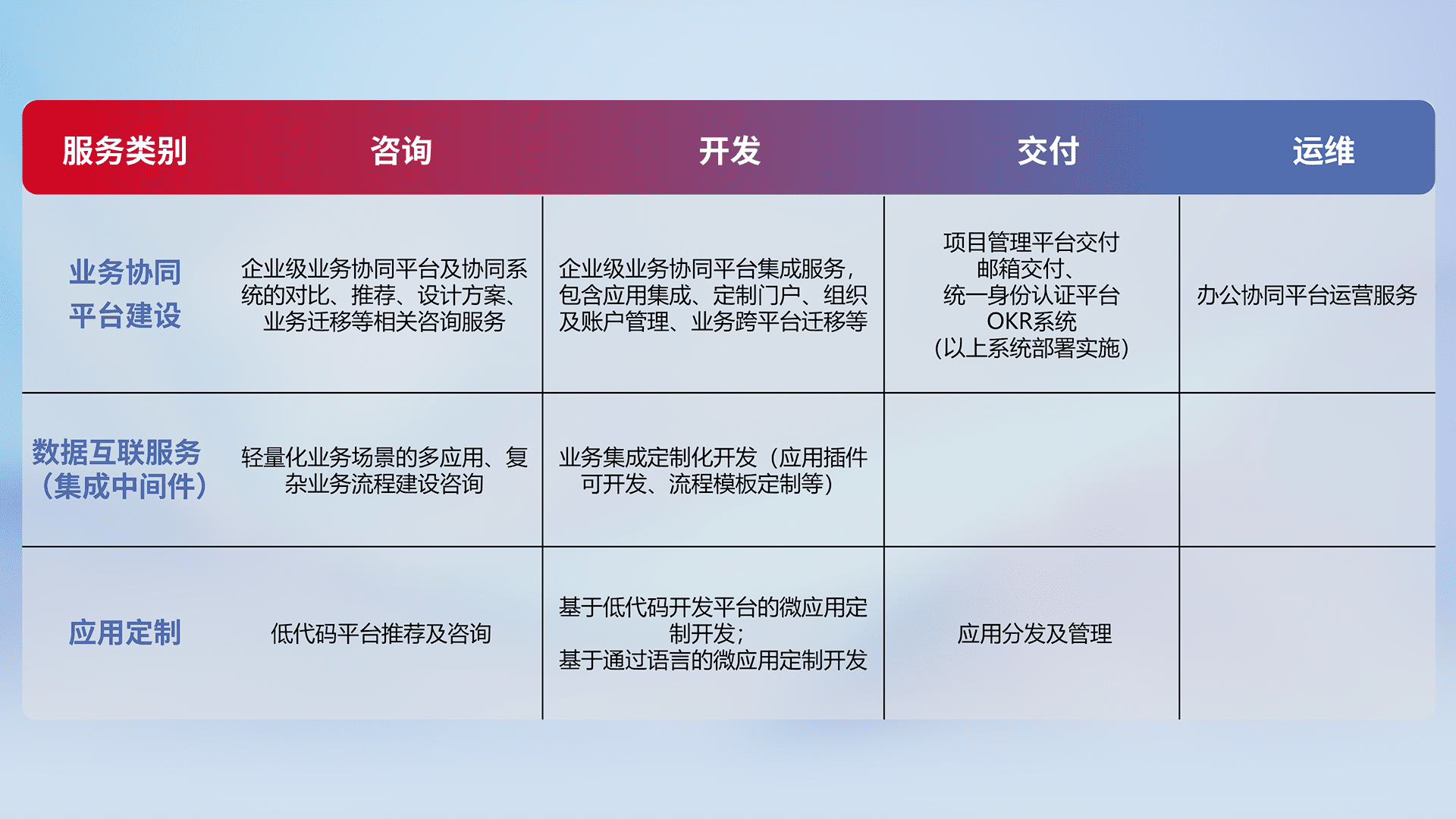 针对钉钉、、企微、、IDaas等平台级产品提供产品的规划、、、方案、、交付、、、定制化开发等服务,,,实现如统一协同办公、、、、智能客户服务、、混合会议管理、、、、智能数据查询、、、等业务场景,,,,实现数字化转型。。。。